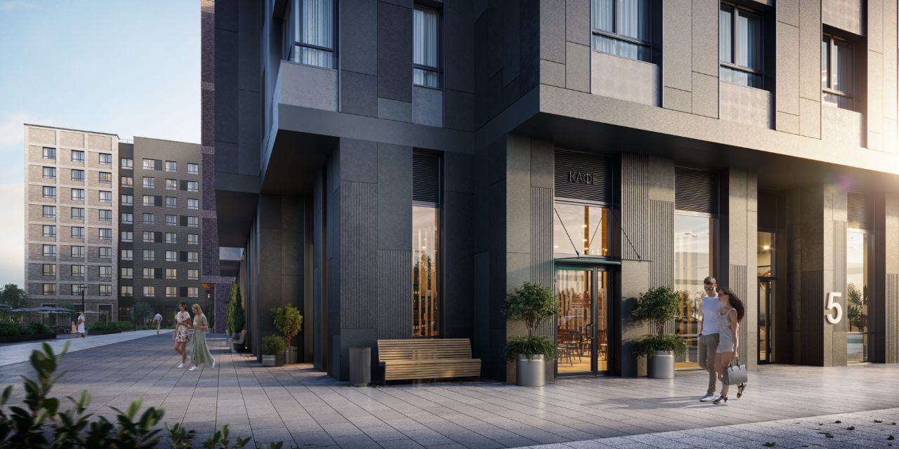 Вход во все парадные квартала будет на уровне земли, а благодаря панорамному остеклению лобби хорошо просматриваются. Внутри помещения — интерьер в нейтральных бежевых тонах. Отделка из натурального камня. элегантная мягкая мебель и дизайнерские светильники создают атмосферу уюта, а декор из живых растений дополняет пространство.